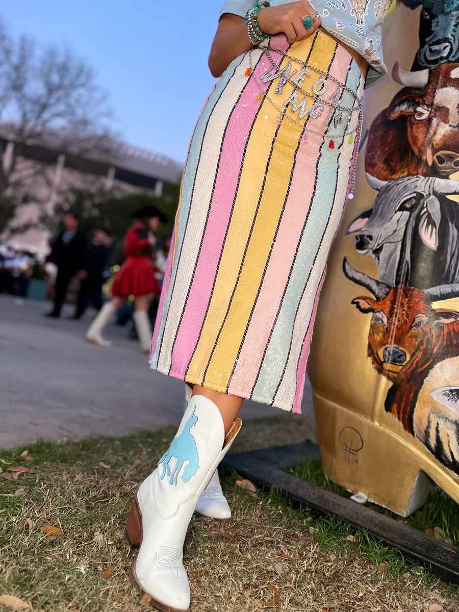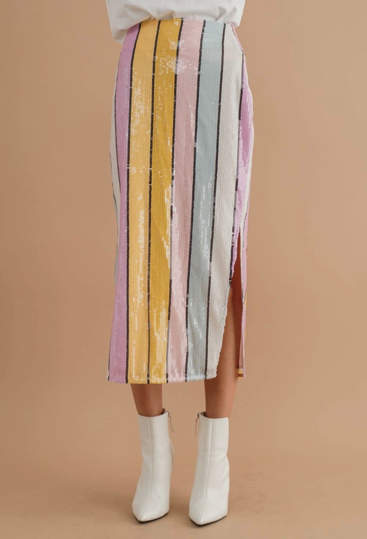 Multi Stripe Sequin Skirt Is Absolutely Gorgeous. True To Size High Waisted Side Slits Is Perfect For Any Occasion. Fully Lined Midi Pencil Skirt With A Side Hidden Zipper.