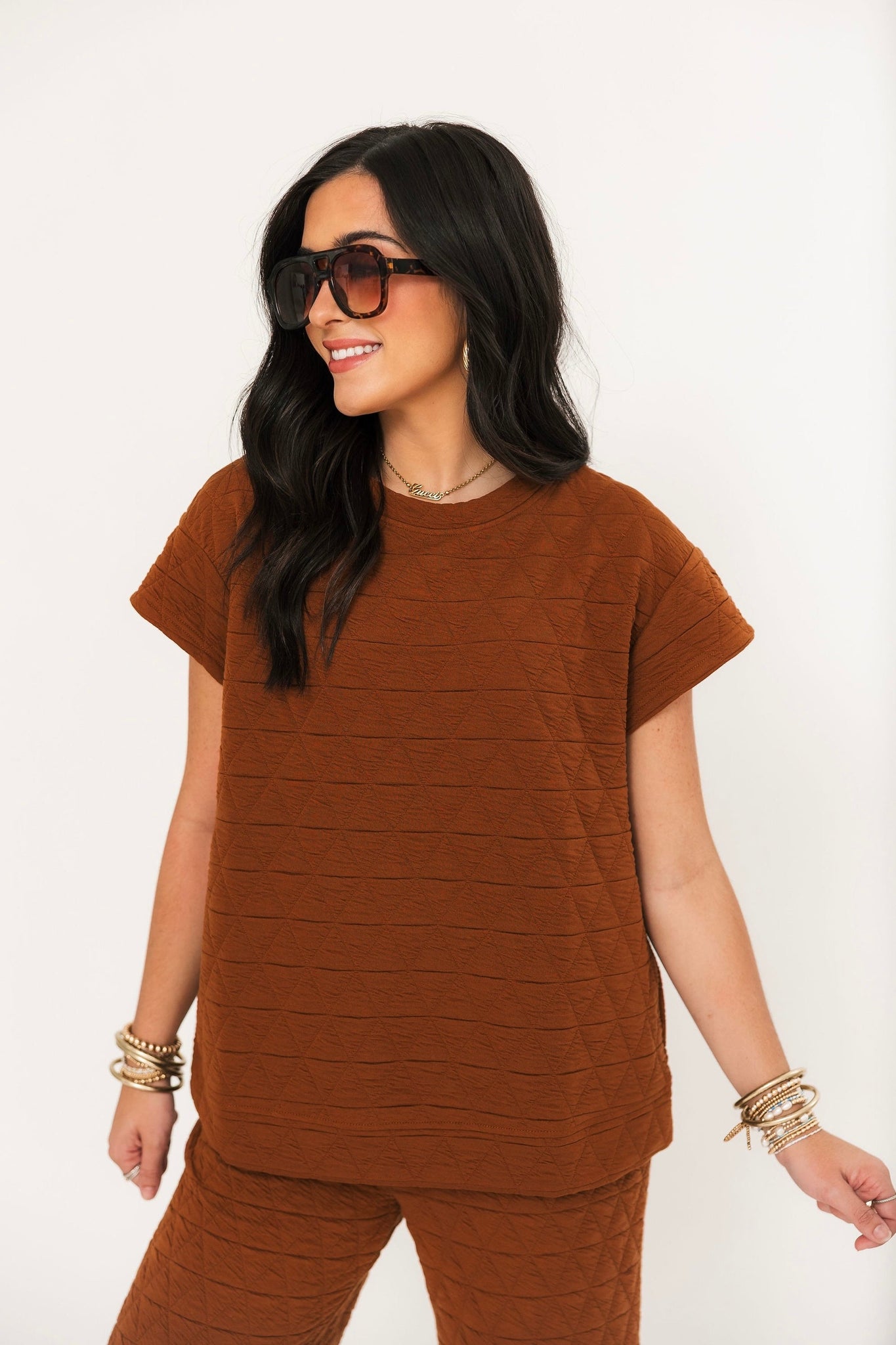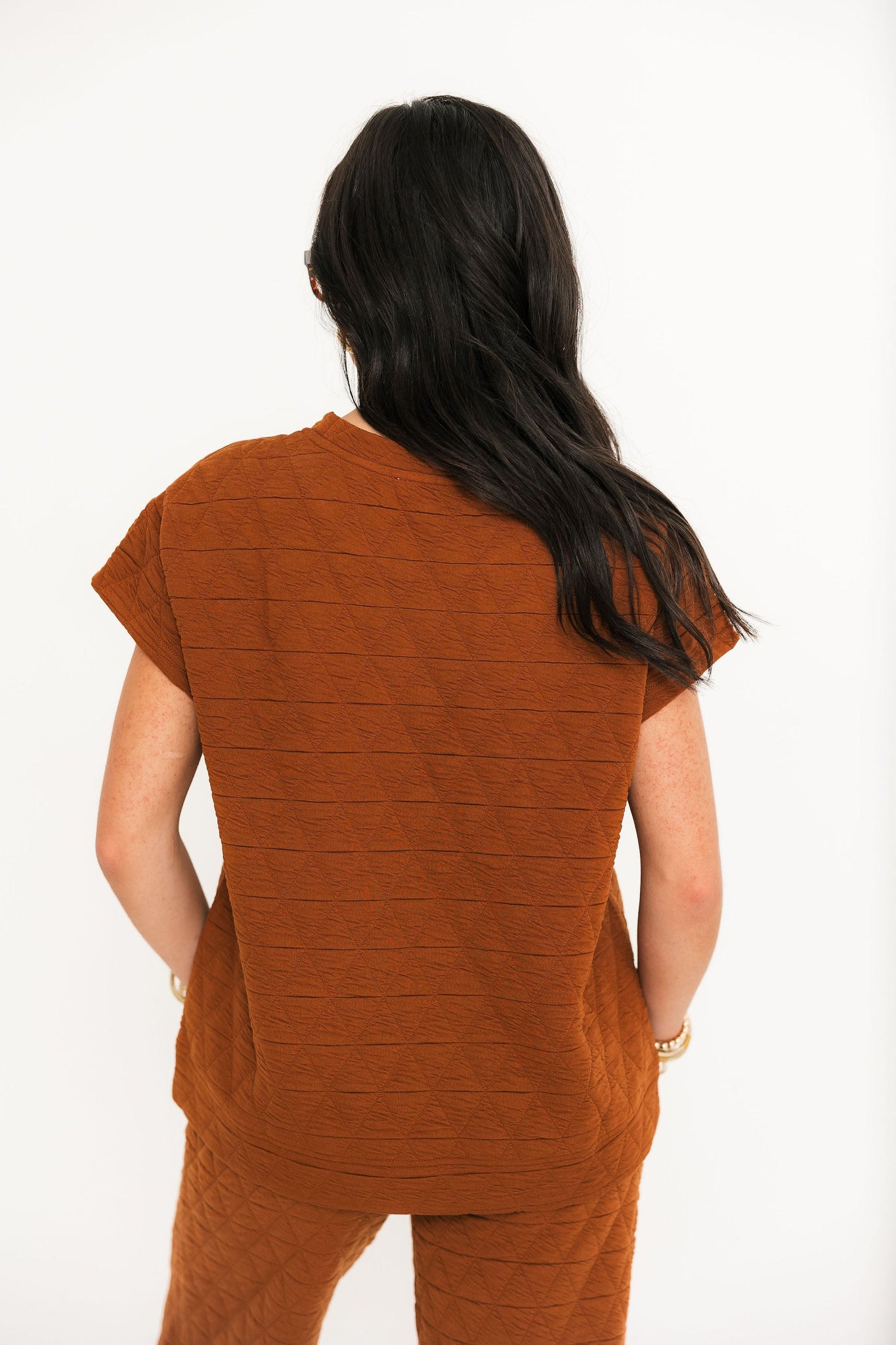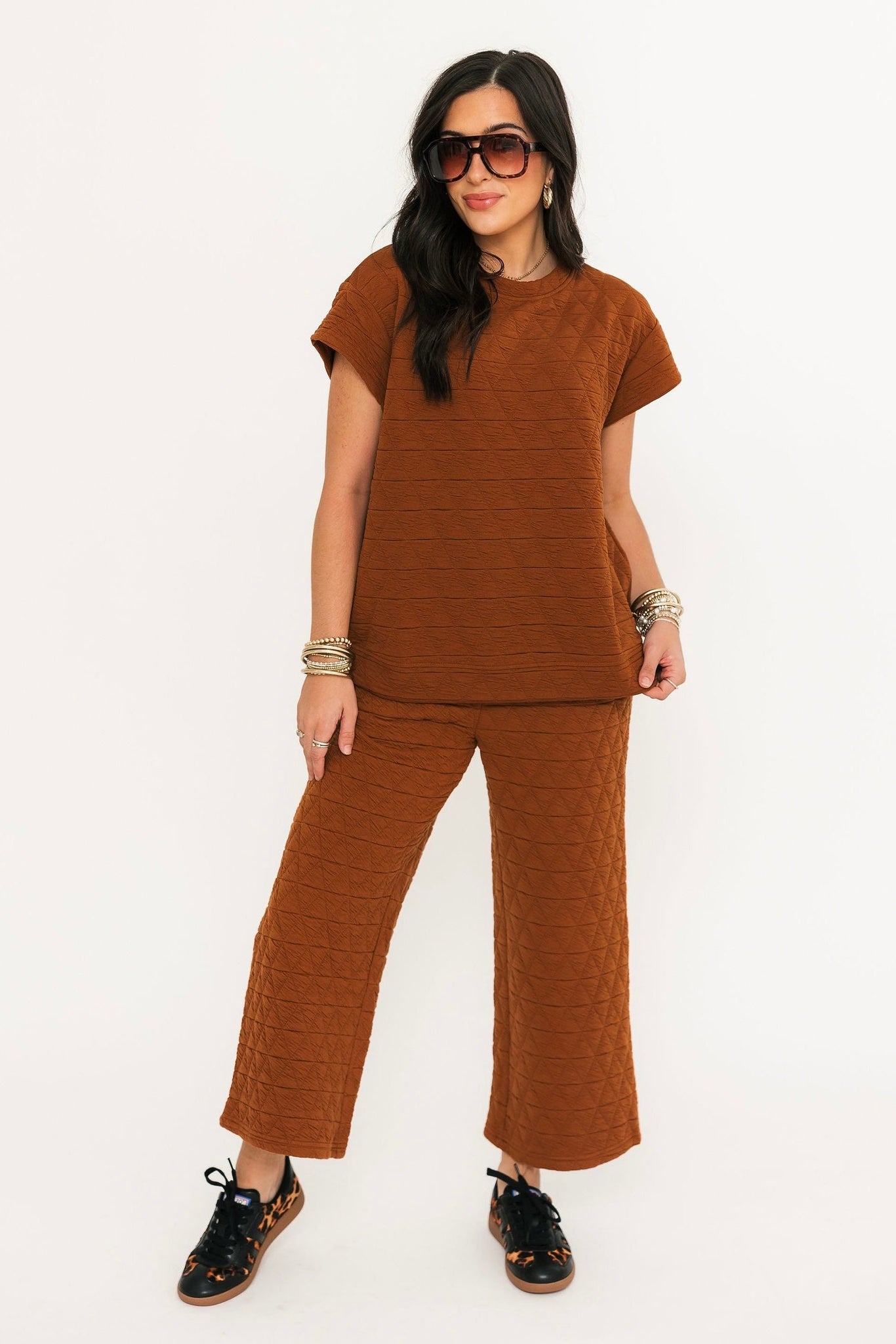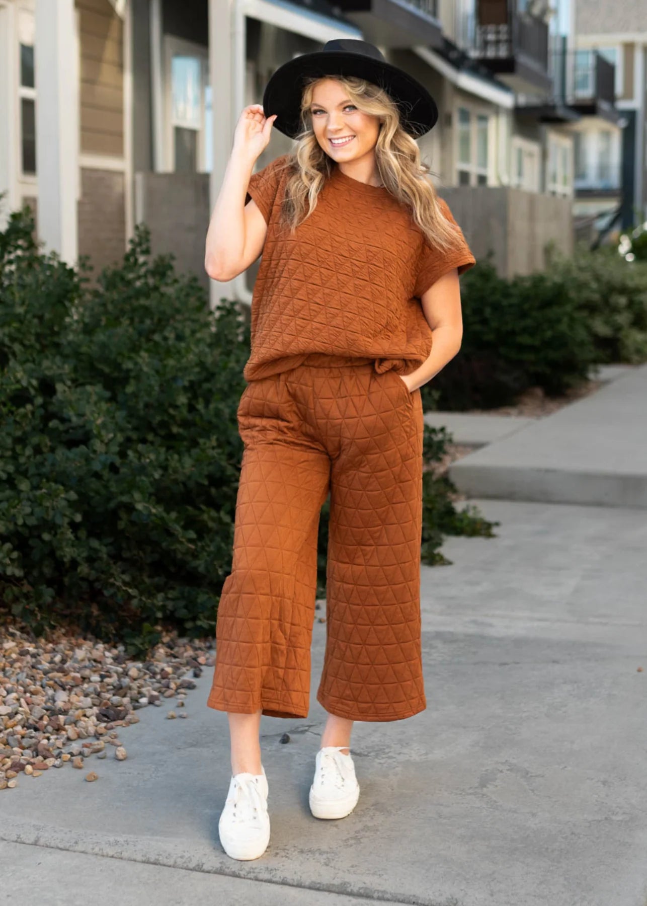 Quilted DetailShort Sleeve Wide Straight LegElastic Waist Side Pockets Lightweight Relax Fit